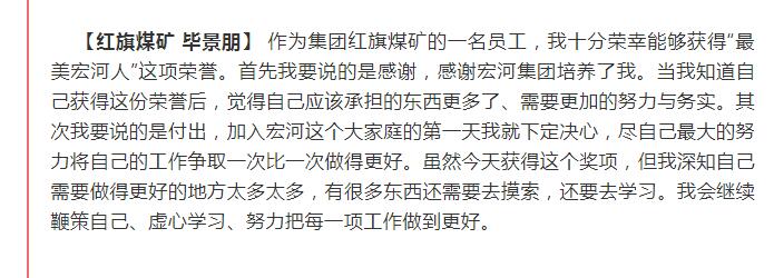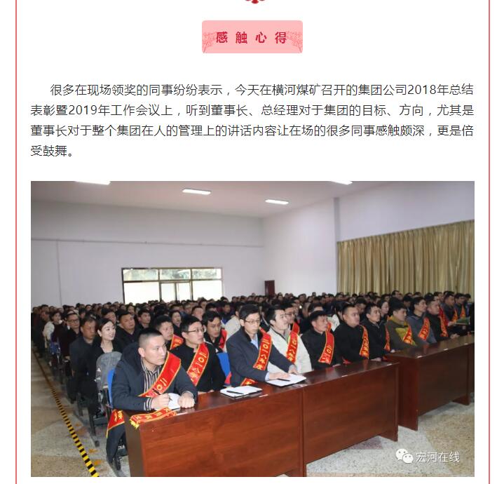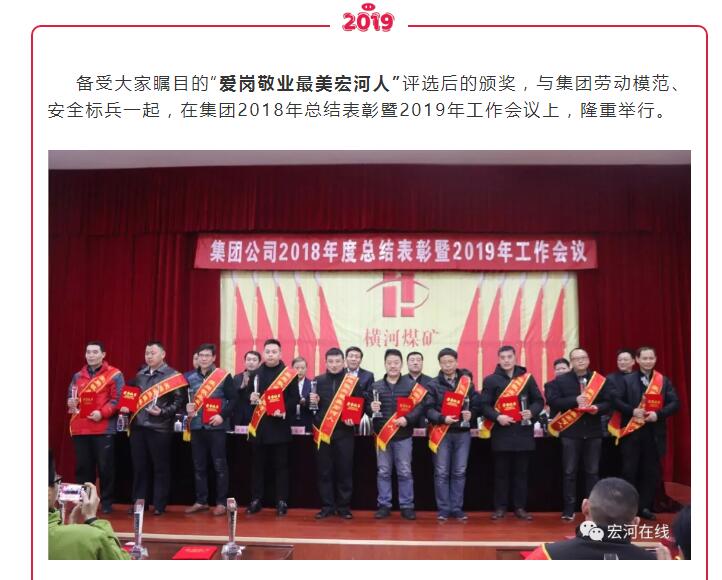 “集團(tuán)這次對2018年工作中涌現(xiàn)出來的勞動(dòng)模范、安全標(biāo)兵和愛崗敬業(yè)最美宏河人等先進(jìn)單位和先進(jìn)個(gè)人,進(jìn)行了隆重表彰。目的就是通過樹立一批扎根基層一線、踏實(shí)苦干實(shí)干的先進(jìn)典型,旗幟鮮明地告訴大家:集團(tuán)黨政始終關(guān)注在煤礦井上下愛崗敬業(yè)的職工,集團(tuán)黨政始終關(guān)注在公司車間班組基層一線愛崗敬業(yè)的職工,集團(tuán)黨政始終關(guān)注在不同崗位上辛勤工作、無私付出、愛崗敬業(yè)的職工。” 集團(tuán)黨委書記、董事長張文,在大會講話中說。